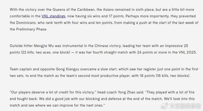 然后,文章提到中国女排的两名队员,说:“主攻手吴梦洁成为取胜关键,全场豪取25分(22次扣杀、2次发球得分、1次拦网)冠绝全队——这是她在2025年世联赛中连续第四场得分超过24分”。相信很多中国球迷都不知道吴梦洁有4场比赛得分超过24分了,国际排联对吴梦洁的关注,可见一斑。